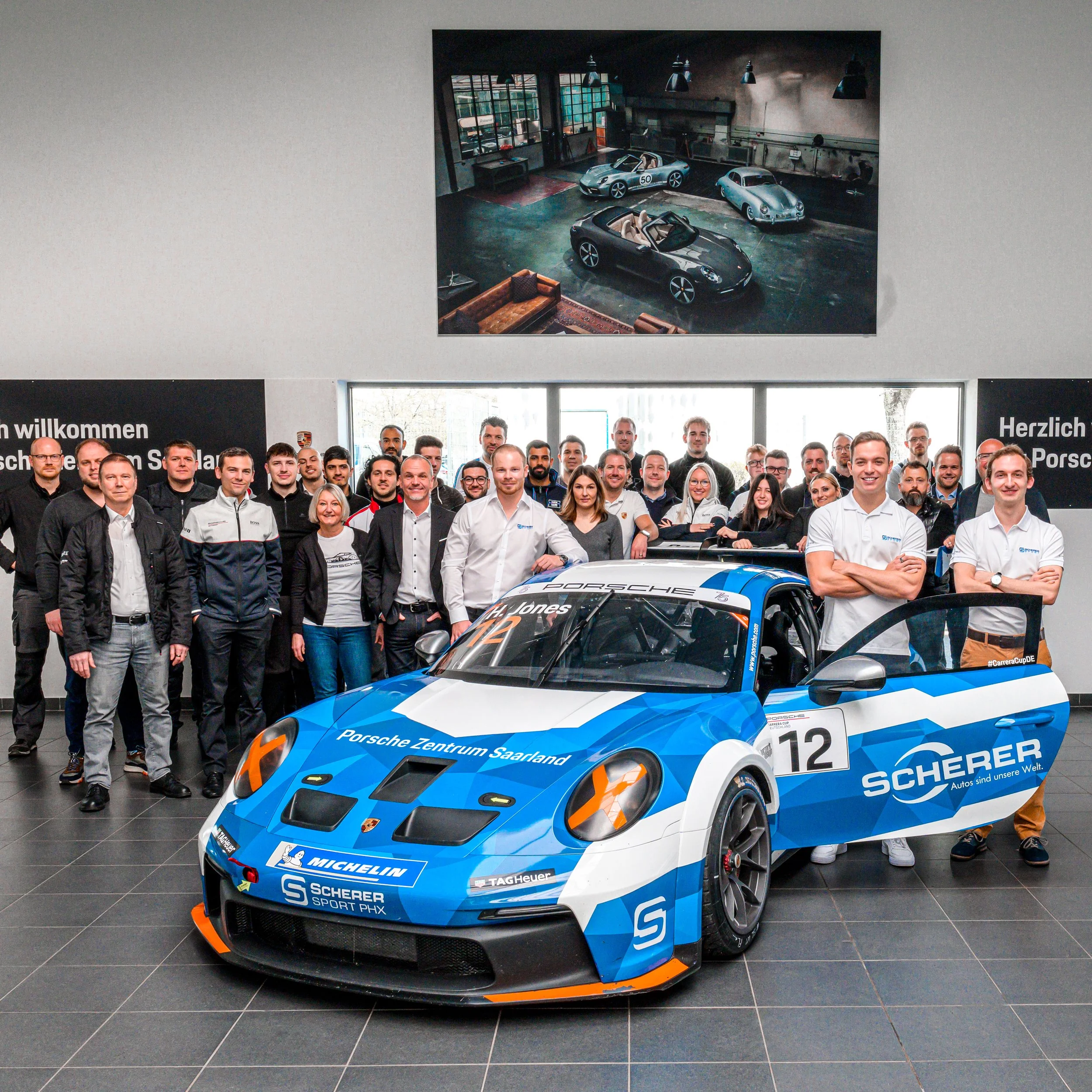 Harri Jones with his 2023 Porsche Carrera Cup Car alongside teammate, Matteo Ferrer at Porsche Zentrum Saarland